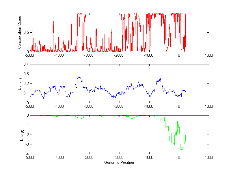 The energy profile (green curve) is about energy for module detection based on TF interaction. The positions with energy less than -1 indicate the existence of CRMs.