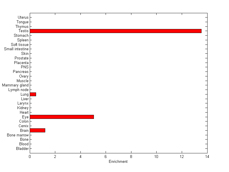 The expression level is normalized with tissue-library size. Each value for a gene in a tissue is a ratio of observed ESTs to the expected one in this tissue. The expected number of ESTs is the product of total ESTs of the gene and the fraction of total ESTs in the tissue among all ESTs in 30 tissues.