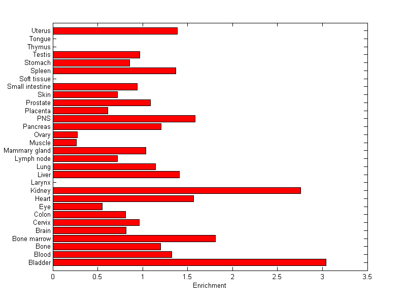 The expression level is normalized with tissue-library size. Each value for a gene in a tissue is a ratio of observed ESTs to the expected one in this tissue. The expected number of ESTs is the product of total ESTs of the gene and the fraction of total ESTs in the tissue among all ESTs in 30 tissues.