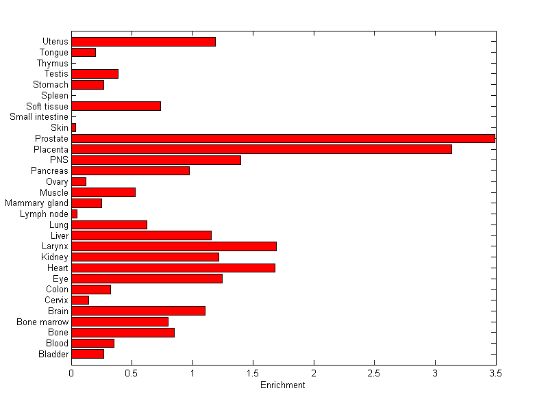 The expression level is normalized with tissue-library size. Each value for a gene in a tissue is a ratio of observed ESTs to the expected one in this tissue. The expected number of ESTs is the product of total ESTs of the gene and the fraction of total ESTs in the tissue among all ESTs in 30 tissues.