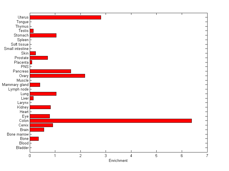The expression level is normalized with tissue-library size. Each value for a gene in a tissue is a ratio of observed ESTs to the expected one in this tissue. The expected number of ESTs is the product of total ESTs of the gene and the fraction of total ESTs in the tissue among all ESTs in 30 tissues.