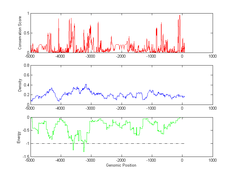 The energy profile (green curve) is about energy for module detection based on TF interaction. The positions with energy less than -1 indicate the existence of CRMs.