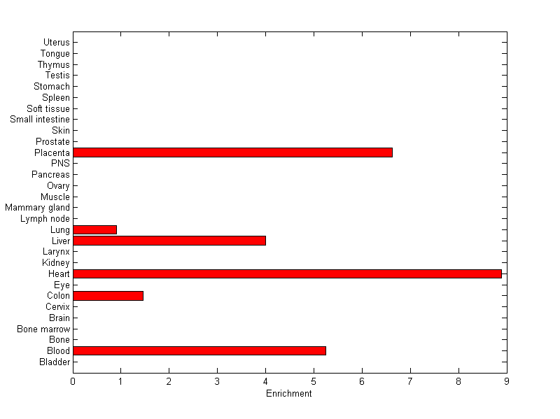 The expression level is normalized with tissue-library size. Each value for a gene in a tissue is a ratio of observed ESTs to the expected one in this tissue. The expected number of ESTs is the product of total ESTs of the gene and the fraction of total ESTs in the tissue among all ESTs in 30 tissues.