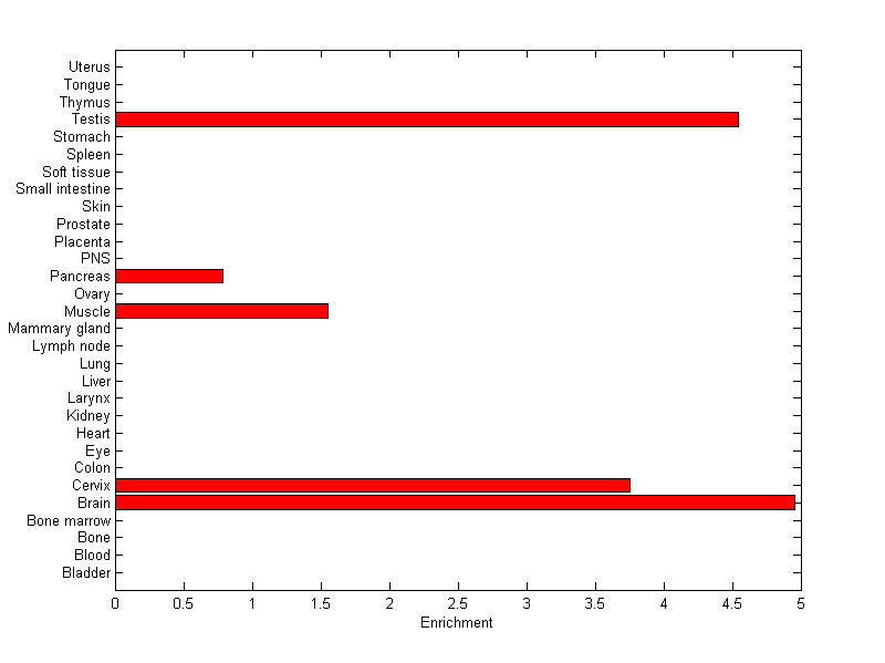 The expression level is normalized with tissue-library size. Each value for a gene in a tissue is a ratio of observed ESTs to the expected one in this tissue. The expected number of ESTs is the product of total ESTs of the gene and the fraction of total ESTs in the tissue among all ESTs in 30 tissues.