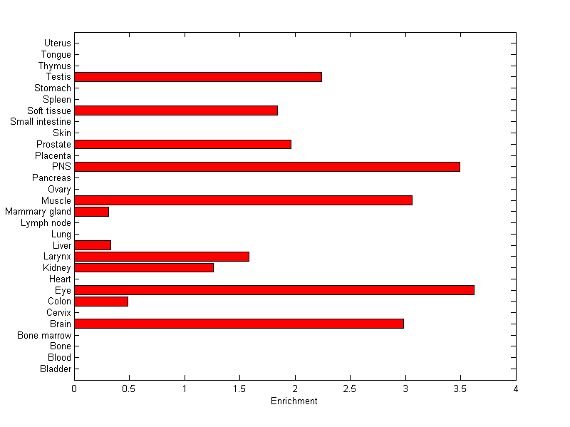 The expression level is normalized with tissue-library size. Each value for a gene in a tissue is a ratio of observed ESTs to the expected one in this tissue. The expected number of ESTs is the product of total ESTs of the gene and the fraction of total ESTs in the tissue among all ESTs in 30 tissues.
