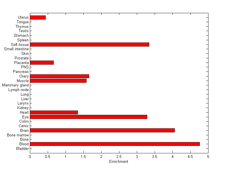 The expression level is normalized with tissue-library size. Each value for a gene in a tissue is a ratio of observed ESTs to the expected one in this tissue. The expected number of ESTs is the product of total ESTs of the gene and the fraction of total ESTs in the tissue among all ESTs in 30 tissues.