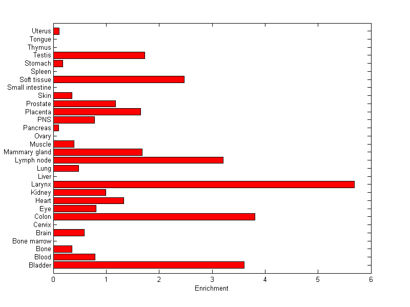 The expression level is normalized with tissue-library size. Each value for a gene in a tissue is a ratio of observed ESTs to the expected one in this tissue. The expected number of ESTs is the product of total ESTs of the gene and the fraction of total ESTs in the tissue among all ESTs in 30 tissues.