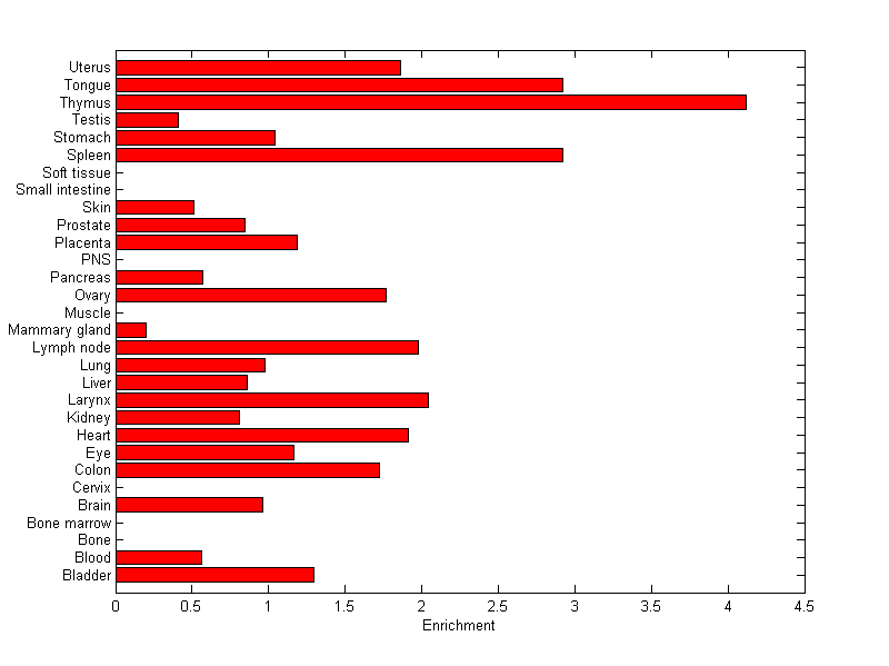 The expression level is normalized with tissue-library size. Each value for a gene in a tissue is a ratio of observed ESTs to the expected one in this tissue. The expected number of ESTs is the product of total ESTs of the gene and the fraction of total ESTs in the tissue among all ESTs in 30 tissues.