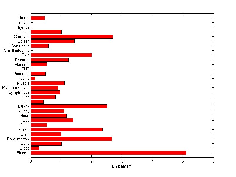 The expression level is normalized with tissue-library size. Each value for a gene in a tissue is a ratio of observed ESTs to the expected one in this tissue. The expected number of ESTs is the product of total ESTs of the gene and the fraction of total ESTs in the tissue among all ESTs in 30 tissues.