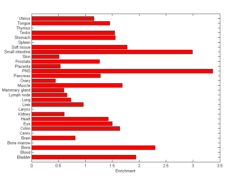 The expression level is normalized with tissue-library size. Each value for a gene in a tissue is a ratio of observed ESTs to the expected one in this tissue. The expected number of ESTs is the product of total ESTs of the gene and the fraction of total ESTs in the tissue among all ESTs in 30 tissues.