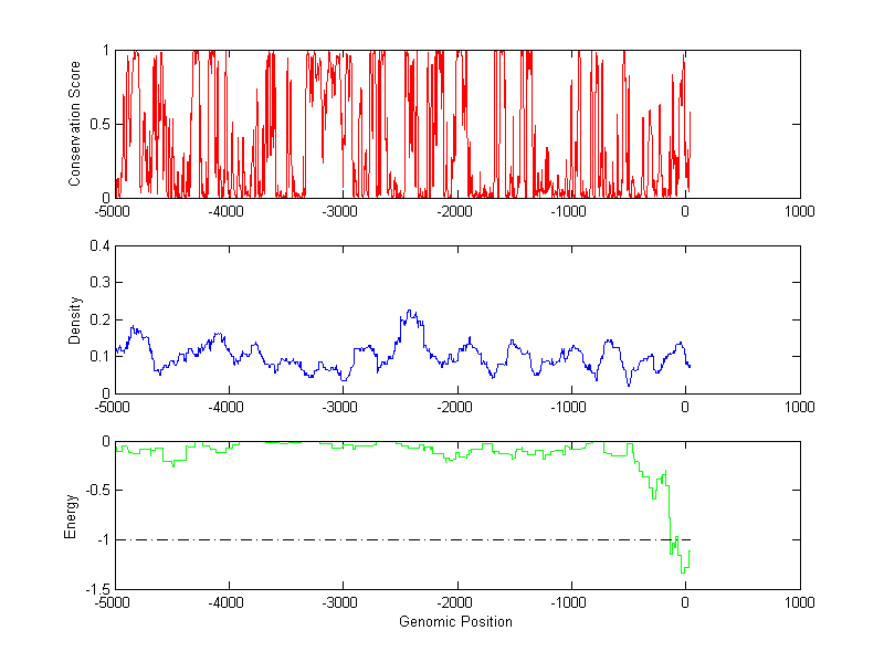The energy profile (green curve) is about energy for module detection based on TF interaction. The positions with energy less than -1 indicate the existence of CRMs.