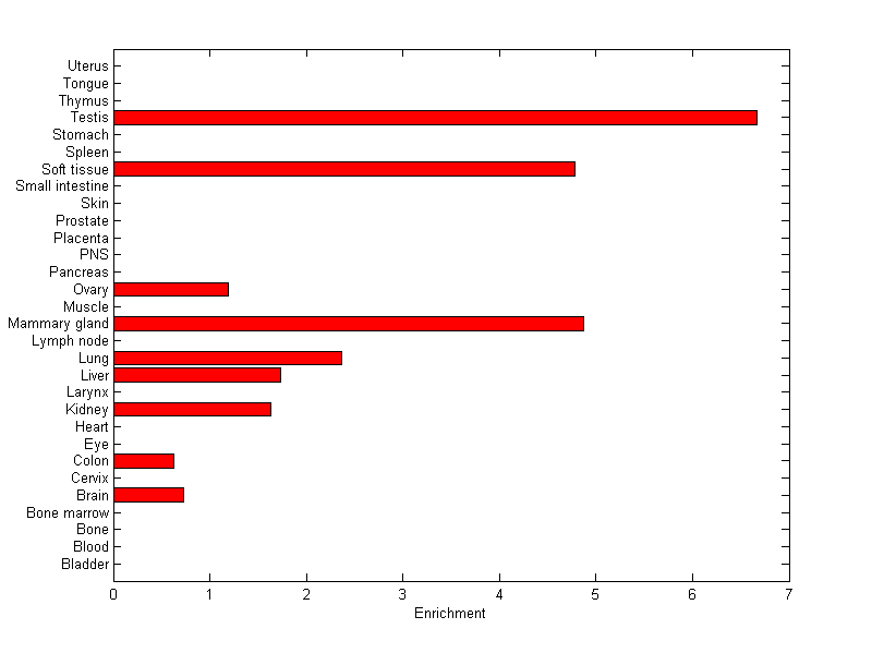 The expression level is normalized with tissue-library size. Each value for a gene in a tissue is a ratio of observed ESTs to the expected one in this tissue. The expected number of ESTs is the product of total ESTs of the gene and the fraction of total ESTs in the tissue among all ESTs in 30 tissues.