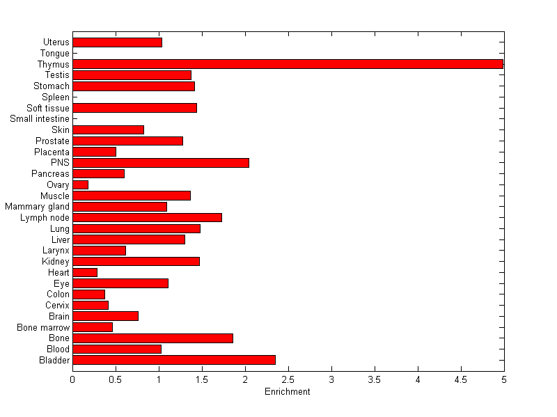 The expression level is normalized with tissue-library size. Each value for a gene in a tissue is a ratio of observed ESTs to the expected one in this tissue. The expected number of ESTs is the product of total ESTs of the gene and the fraction of total ESTs in the tissue among all ESTs in 30 tissues.