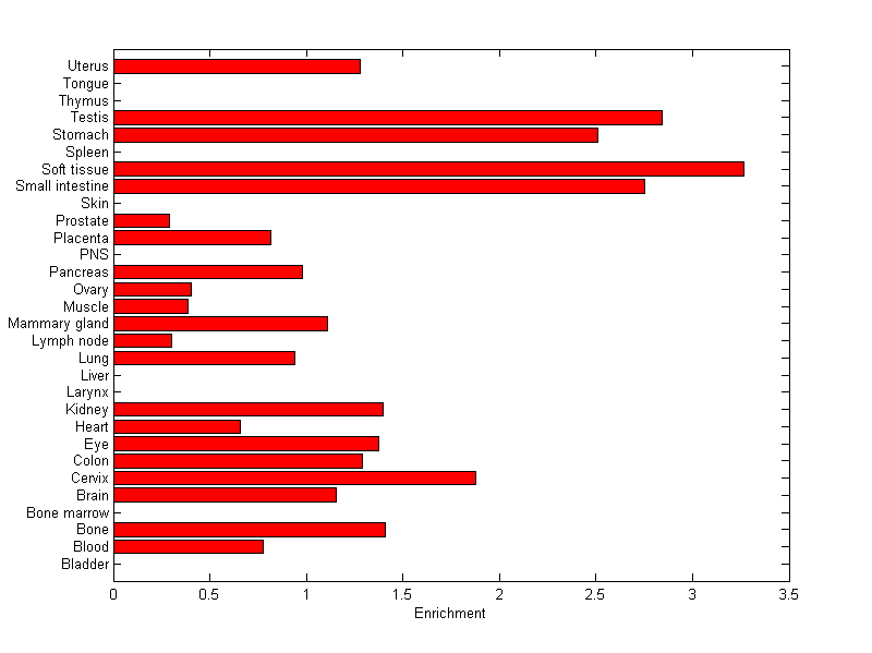 The expression level is normalized with tissue-library size. Each value for a gene in a tissue is a ratio of observed ESTs to the expected one in this tissue. The expected number of ESTs is the product of total ESTs of the gene and the fraction of total ESTs in the tissue among all ESTs in 30 tissues.