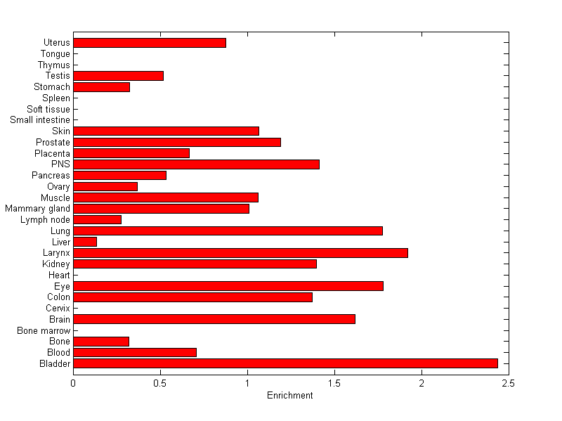 The expression level is normalized with tissue-library size. Each value for a gene in a tissue is a ratio of observed ESTs to the expected one in this tissue. The expected number of ESTs is the product of total ESTs of the gene and the fraction of total ESTs in the tissue among all ESTs in 30 tissues.