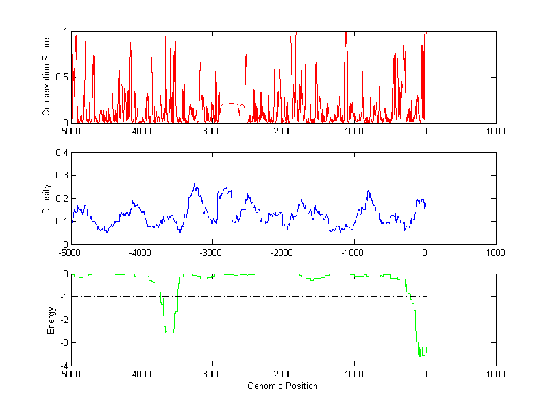 The energy profile (green curve) is about energy for module detection based on TF interaction. The positions with energy less than -1 indicate the existence of CRMs.