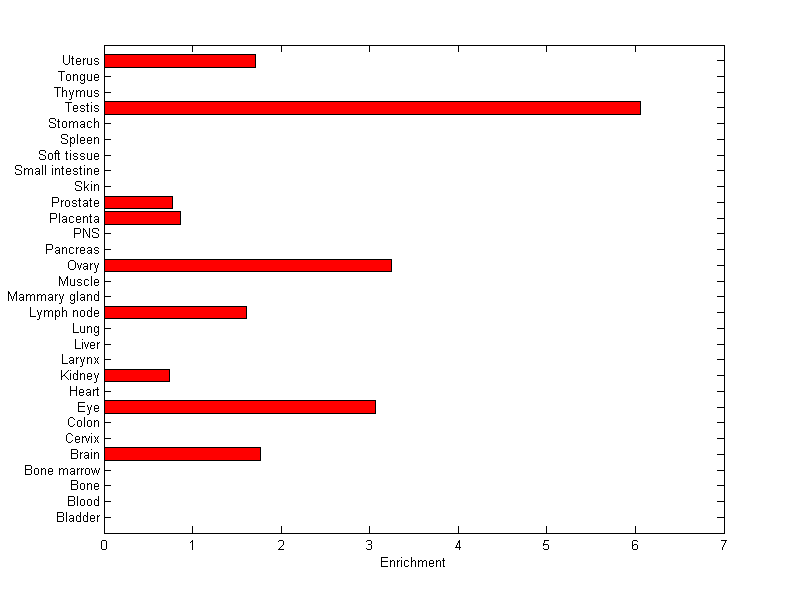 The expression level is normalized with tissue-library size. Each value for a gene in a tissue is a ratio of observed ESTs to the expected one in this tissue. The expected number of ESTs is the product of total ESTs of the gene and the fraction of total ESTs in the tissue among all ESTs in 30 tissues.