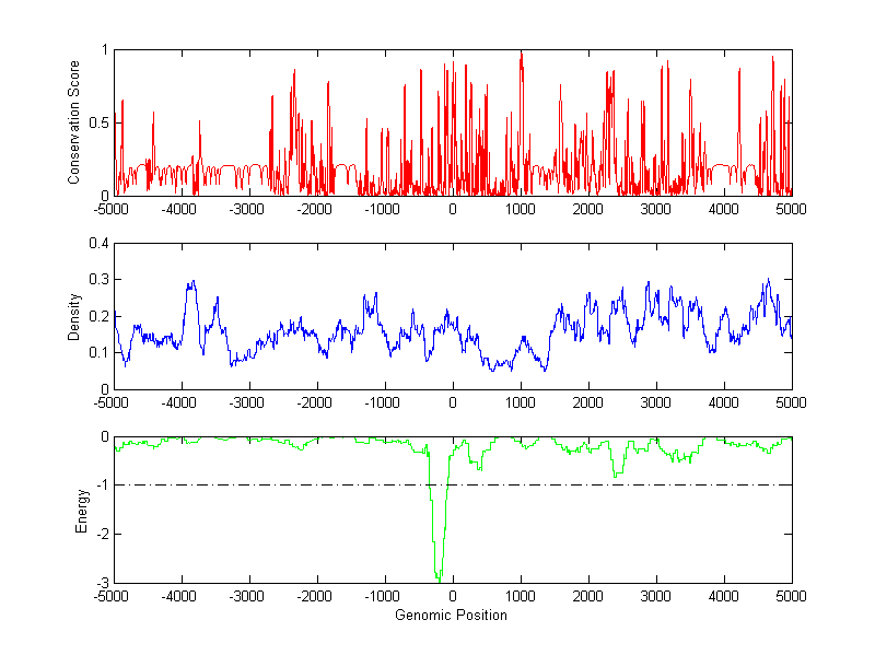 The energy profile (green curve) is about energy for module detection based on TF interaction. The positions with energy less than -1 indicate the existence of CRMs.