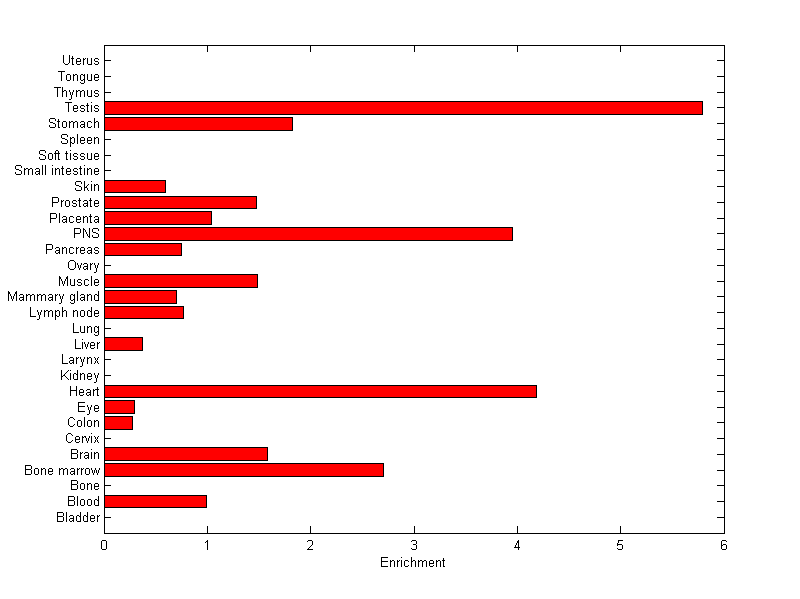 The expression level is normalized with tissue-library size. Each value for a gene in a tissue is a ratio of observed ESTs to the expected one in this tissue. The expected number of ESTs is the product of total ESTs of the gene and the fraction of total ESTs in the tissue among all ESTs in 30 tissues.