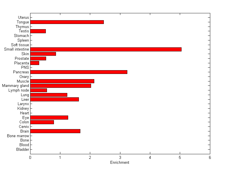 The expression level is normalized with tissue-library size. Each value for a gene in a tissue is a ratio of observed ESTs to the expected one in this tissue. The expected number of ESTs is the product of total ESTs of the gene and the fraction of total ESTs in the tissue among all ESTs in 30 tissues.