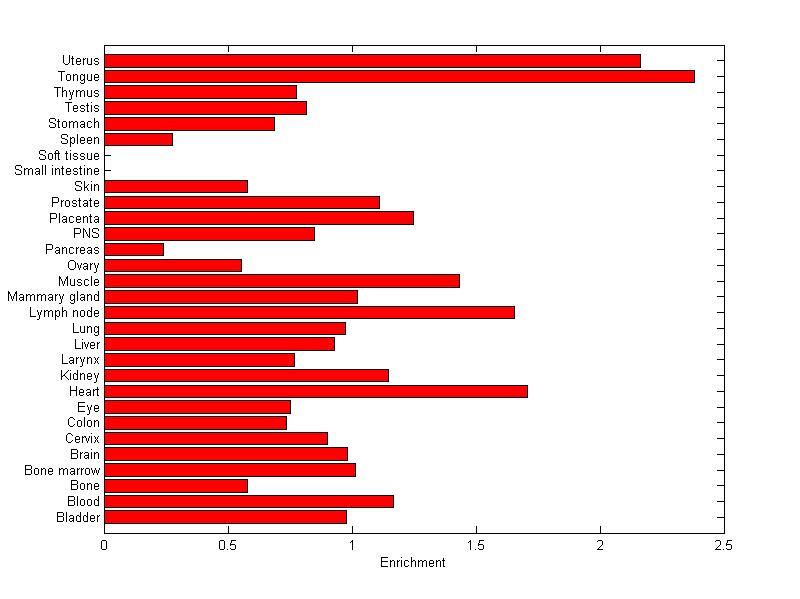 The expression level is normalized with tissue-library size. Each value for a gene in a tissue is a ratio of observed ESTs to the expected one in this tissue. The expected number of ESTs is the product of total ESTs of the gene and the fraction of total ESTs in the tissue among all ESTs in 30 tissues.