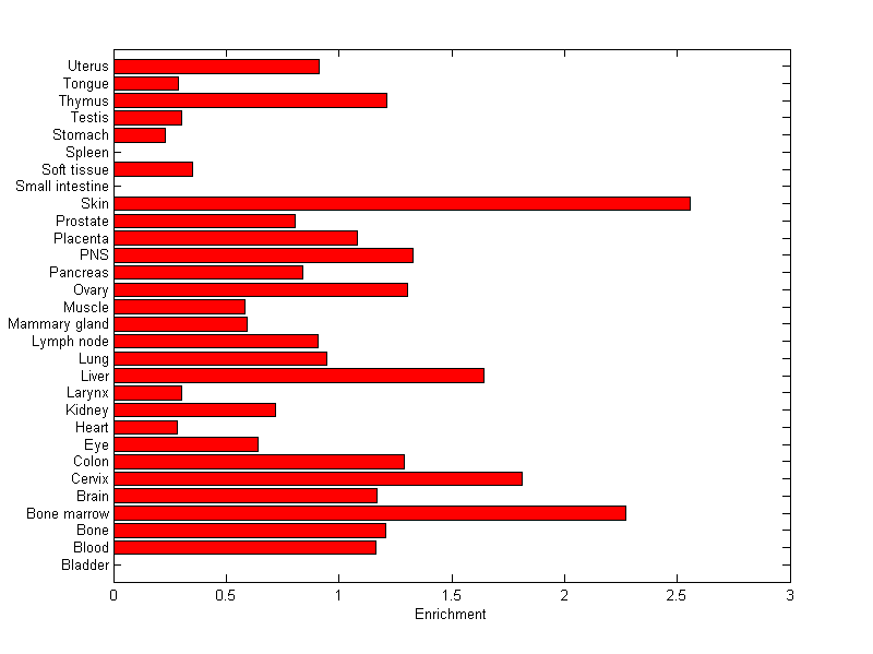 The expression level is normalized with tissue-library size. Each value for a gene in a tissue is a ratio of observed ESTs to the expected one in this tissue. The expected number of ESTs is the product of total ESTs of the gene and the fraction of total ESTs in the tissue among all ESTs in 30 tissues.