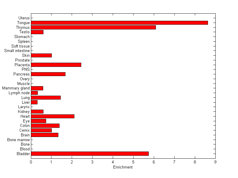 The expression level is normalized with tissue-library size. Each value for a gene in a tissue is a ratio of observed ESTs to the expected one in this tissue. The expected number of ESTs is the product of total ESTs of the gene and the fraction of total ESTs in the tissue among all ESTs in 30 tissues.