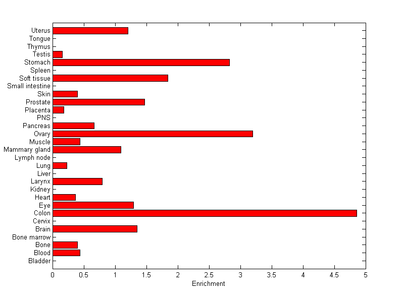 The expression level is normalized with tissue-library size. Each value for a gene in a tissue is a ratio of observed ESTs to the expected one in this tissue. The expected number of ESTs is the product of total ESTs of the gene and the fraction of total ESTs in the tissue among all ESTs in 30 tissues.