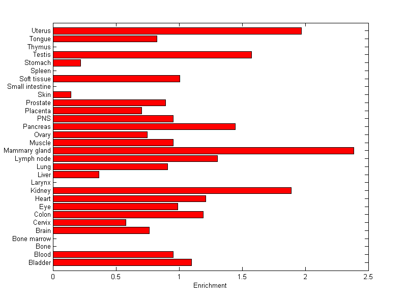 The expression level is normalized with tissue-library size. Each value for a gene in a tissue is a ratio of observed ESTs to the expected one in this tissue. The expected number of ESTs is the product of total ESTs of the gene and the fraction of total ESTs in the tissue among all ESTs in 30 tissues.