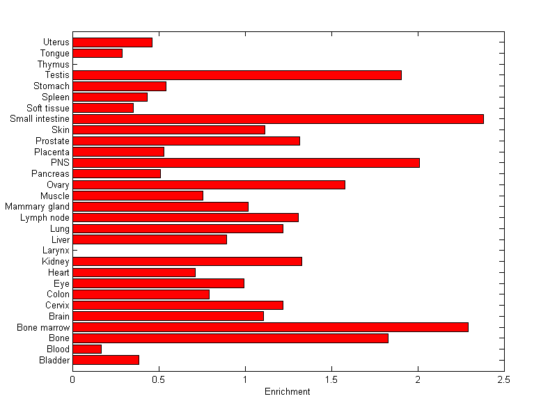 The expression level is normalized with tissue-library size. Each value for a gene in a tissue is a ratio of observed ESTs to the expected one in this tissue. The expected number of ESTs is the product of total ESTs of the gene and the fraction of total ESTs in the tissue among all ESTs in 30 tissues.