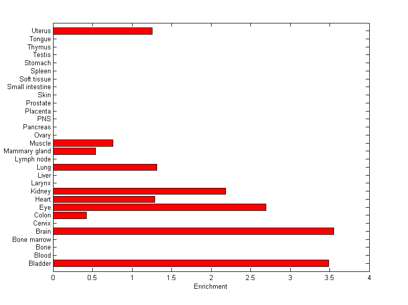 The expression level is normalized with tissue-library size. Each value for a gene in a tissue is a ratio of observed ESTs to the expected one in this tissue. The expected number of ESTs is the product of total ESTs of the gene and the fraction of total ESTs in the tissue among all ESTs in 30 tissues.