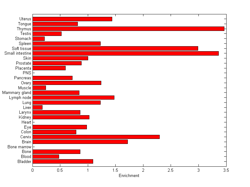 The expression level is normalized with tissue-library size. Each value for a gene in a tissue is a ratio of observed ESTs to the expected one in this tissue. The expected number of ESTs is the product of total ESTs of the gene and the fraction of total ESTs in the tissue among all ESTs in 30 tissues.