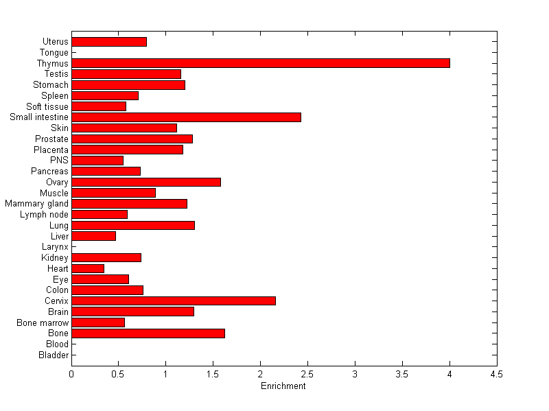 The expression level is normalized with tissue-library size. Each value for a gene in a tissue is a ratio of observed ESTs to the expected one in this tissue. The expected number of ESTs is the product of total ESTs of the gene and the fraction of total ESTs in the tissue among all ESTs in 30 tissues.