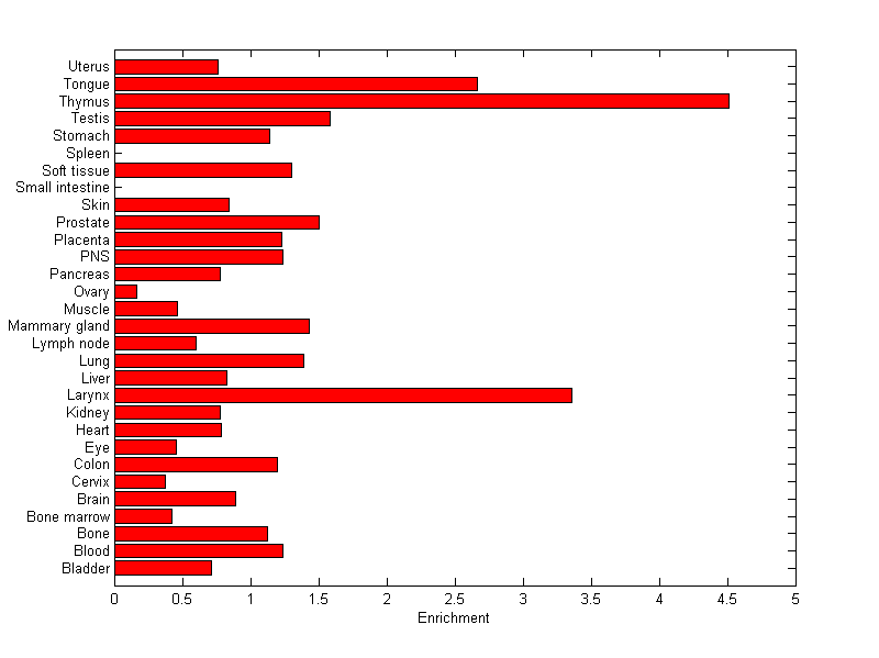 The expression level is normalized with tissue-library size. Each value for a gene in a tissue is a ratio of observed ESTs to the expected one in this tissue. The expected number of ESTs is the product of total ESTs of the gene and the fraction of total ESTs in the tissue among all ESTs in 30 tissues.