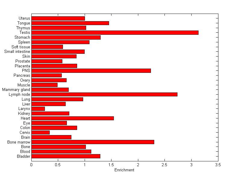 The expression level is normalized with tissue-library size. Each value for a gene in a tissue is a ratio of observed ESTs to the expected one in this tissue. The expected number of ESTs is the product of total ESTs of the gene and the fraction of total ESTs in the tissue among all ESTs in 30 tissues.