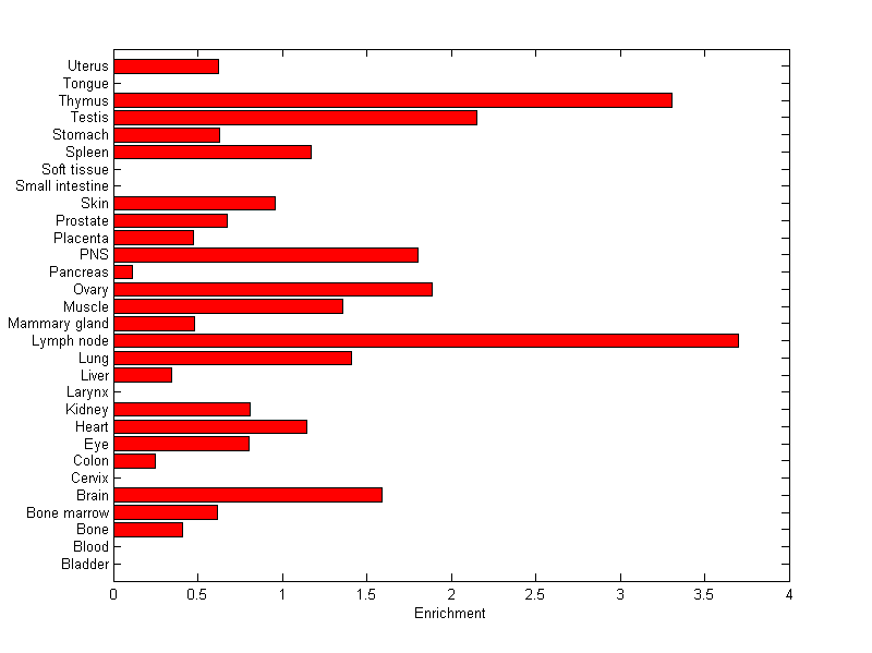 The expression level is normalized with tissue-library size. Each value for a gene in a tissue is a ratio of observed ESTs to the expected one in this tissue. The expected number of ESTs is the product of total ESTs of the gene and the fraction of total ESTs in the tissue among all ESTs in 30 tissues.