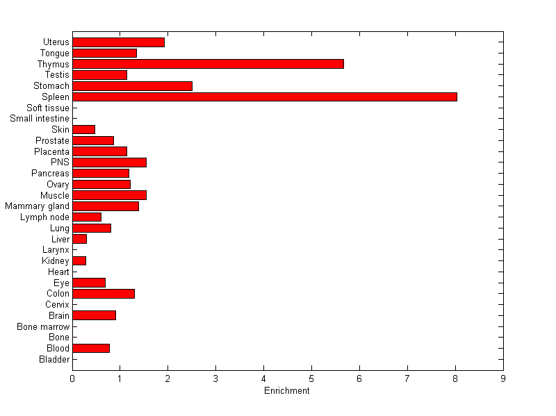 The expression level is normalized with tissue-library size. Each value for a gene in a tissue is a ratio of observed ESTs to the expected one in this tissue. The expected number of ESTs is the product of total ESTs of the gene and the fraction of total ESTs in the tissue among all ESTs in 30 tissues.