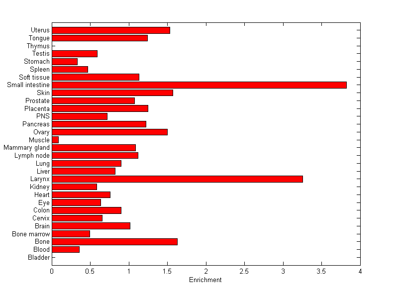 The expression level is normalized with tissue-library size. Each value for a gene in a tissue is a ratio of observed ESTs to the expected one in this tissue. The expected number of ESTs is the product of total ESTs of the gene and the fraction of total ESTs in the tissue among all ESTs in 30 tissues.