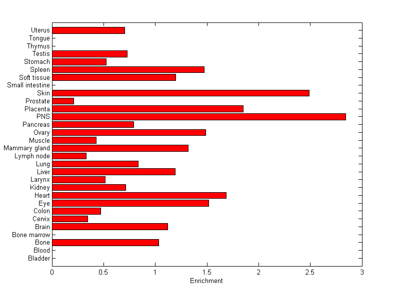 The expression level is normalized with tissue-library size. Each value for a gene in a tissue is a ratio of observed ESTs to the expected one in this tissue. The expected number of ESTs is the product of total ESTs of the gene and the fraction of total ESTs in the tissue among all ESTs in 30 tissues.