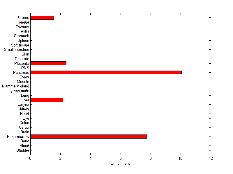 The expression level is normalized with tissue-library size. Each value for a gene in a tissue is a ratio of observed ESTs to the expected one in this tissue. The expected number of ESTs is the product of total ESTs of the gene and the fraction of total ESTs in the tissue among all ESTs in 30 tissues.