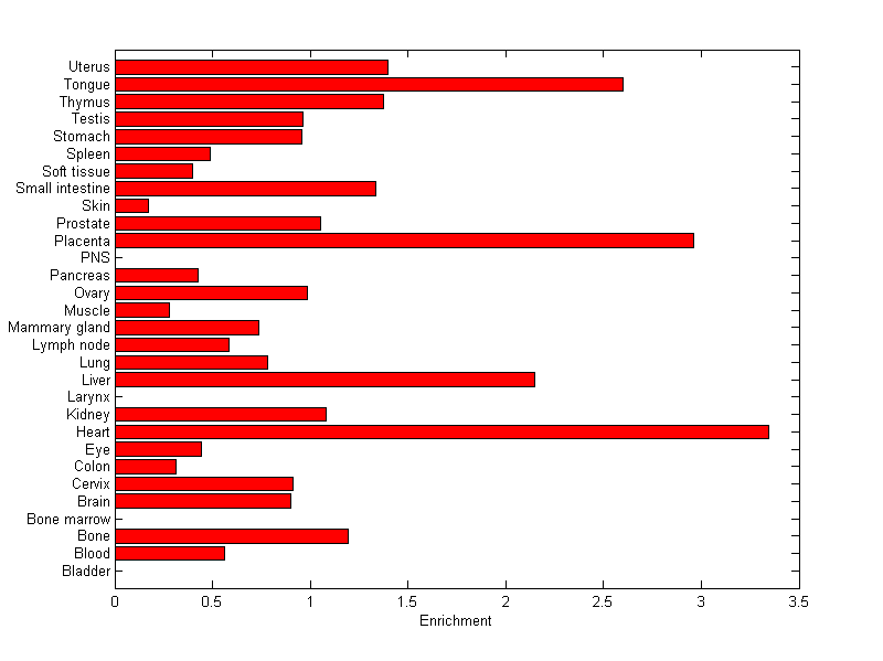 The expression level is normalized with tissue-library size. Each value for a gene in a tissue is a ratio of observed ESTs to the expected one in this tissue. The expected number of ESTs is the product of total ESTs of the gene and the fraction of total ESTs in the tissue among all ESTs in 30 tissues.