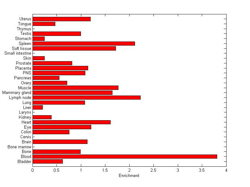 The expression level is normalized with tissue-library size. Each value for a gene in a tissue is a ratio of observed ESTs to the expected one in this tissue. The expected number of ESTs is the product of total ESTs of the gene and the fraction of total ESTs in the tissue among all ESTs in 30 tissues.