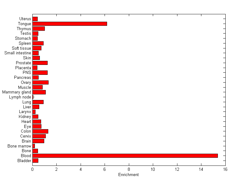 The expression level is normalized with tissue-library size. Each value for a gene in a tissue is a ratio of observed ESTs to the expected one in this tissue. The expected number of ESTs is the product of total ESTs of the gene and the fraction of total ESTs in the tissue among all ESTs in 30 tissues.