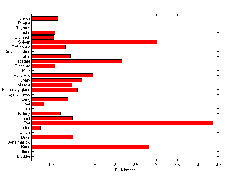 The expression level is normalized with tissue-library size. Each value for a gene in a tissue is a ratio of observed ESTs to the expected one in this tissue. The expected number of ESTs is the product of total ESTs of the gene and the fraction of total ESTs in the tissue among all ESTs in 30 tissues.