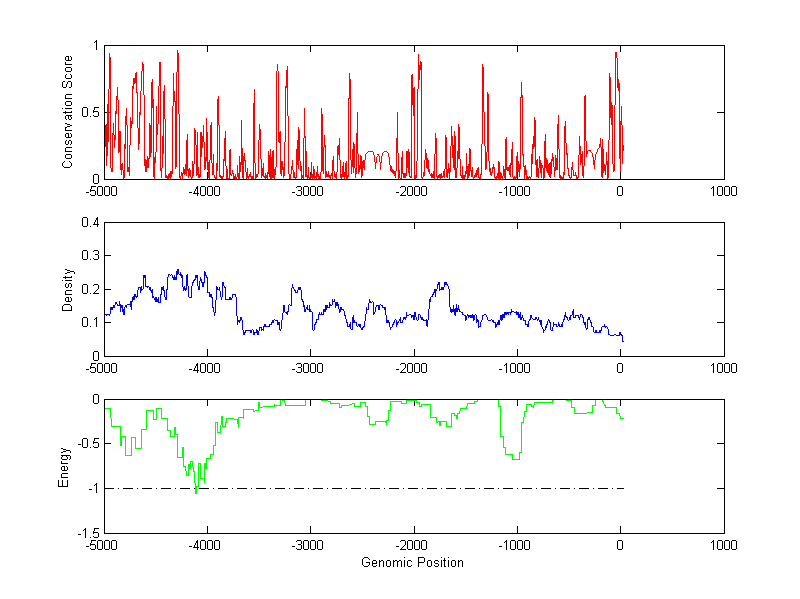 About the profiles: The conservation profile (red curve) is about conservation scores of the promoter sequences. Conservation was determined from an eight-way alignment of human, chimpanzee, dog, mouse, rat, chicken, zebrafish and fugu sequences. The conservation was quantified by a conservation score between 0 and 1, with 1 as highest conservation. The conservation score was obtained from UCSC genome databases. The density profile (blue curve) is about density of all TF binding sites. The energy profile (green curve) is about energy for module detection based on TF interaction. The positions with energy less than -1 indicate the existence of CRMs. Download: Conservation profileDensity profile Energy profile CRM summary |