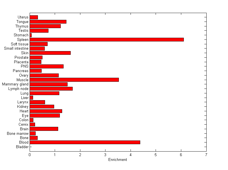 About the profile: The expression level is normalized with tissue-library size. Each value for a gene in a tissue is a ratio of observed ESTs to the expected one in this tissue. The expected number of ESTs is the product of total ESTs of the gene and the fraction of total ESTs in the tissue among all ESTs in 30 tissues. Summary: This gene is preferentially expressed in [spleen] Download: |