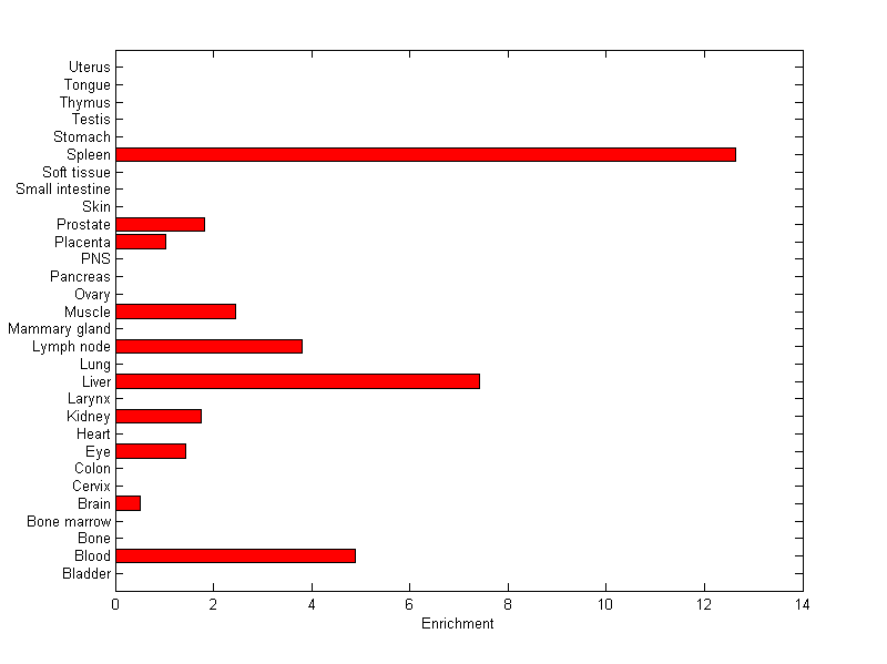 The expression level is normalized with tissue-library size. Each value for a gene in a tissue is a ratio of observed ESTs to the expected one in this tissue. The expected number of ESTs is the product of total ESTs of the gene and the fraction of total ESTs in the tissue among all ESTs in 30 tissues.