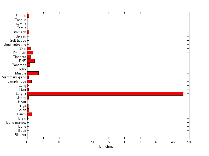 The expression level is normalized with tissue-library size. Each value for a gene in a tissue is a ratio of observed ESTs to the expected one in this tissue. The expected number of ESTs is the product of total ESTs of the gene and the fraction of total ESTs in the tissue among all ESTs in 30 tissues.