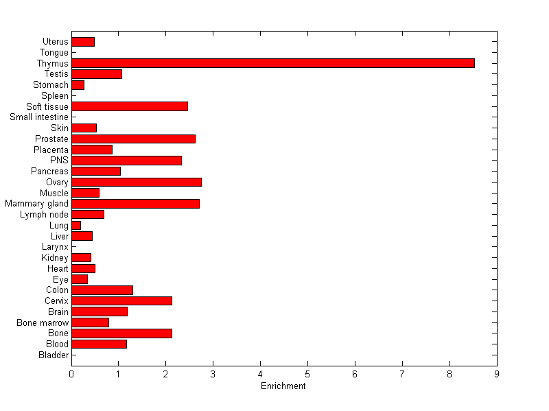 The expression level is normalized with tissue-library size. Each value for a gene in a tissue is a ratio of observed ESTs to the expected one in this tissue. The expected number of ESTs is the product of total ESTs of the gene and the fraction of total ESTs in the tissue among all ESTs in 30 tissues.