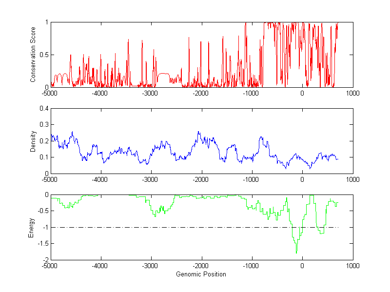 About the profiles: The conservation profile (red curve) is about conservation scores of the promoter sequences. Conservation was determined from an eight-way alignment of human, chimpanzee, dog, mouse, rat, chicken, zebrafish and fugu sequences. The conservation was quantified by a conservation score between 0 and 1, with 1 as highest conservation. The conservation score was obtained from UCSC genome databases. The density profile (blue curve) is about density of all TF binding sites. The energy profile (green curve) is about energy for module detection based on TF interaction. The positions with energy less than -1 indicate the existence of CRMs. Download: Conservation profileDensity profile Energy profile CRM summary |
